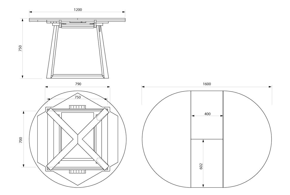 Размер в собранном виде 1200*1200*750 мм, в разложенном виде — 1600*1200*750 мм.